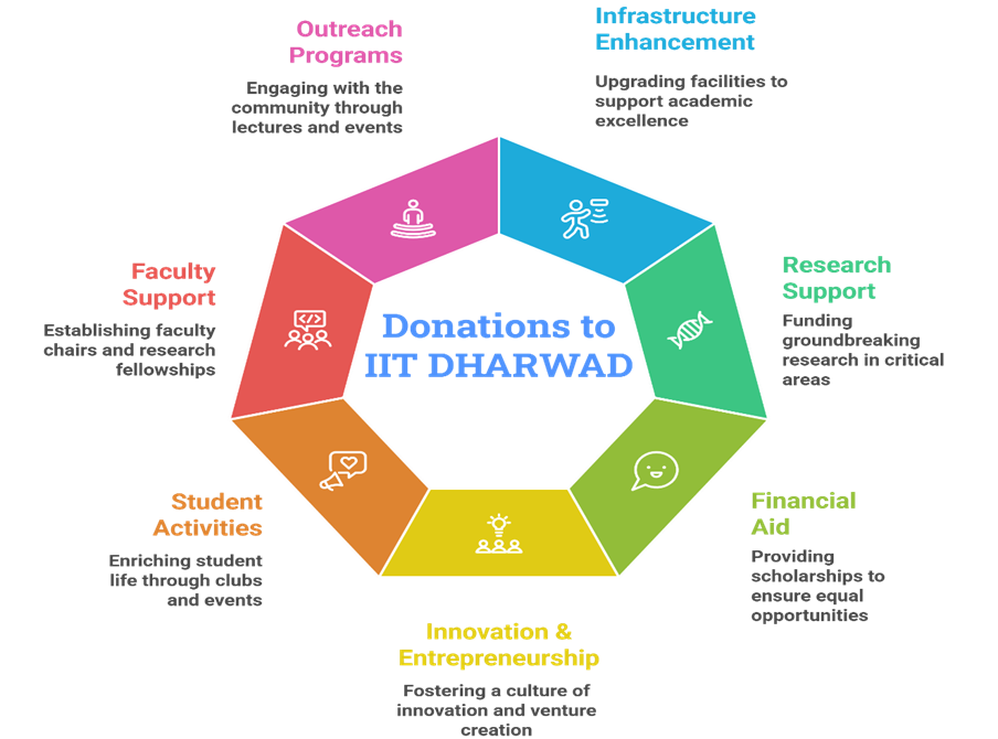 Your generous contributions will directly support the institute's mission of providing world-class education, fostering cutting-edge research, and nurturing the next generation of leaders and innovators. By donating, you are helping shape the future of India’s technological growth and strengthening a vibrant academic community. All donations to IIT Dharwad are eligible for exemption under Section 80G of the Income Tax Act, making your contribution even more impactful.