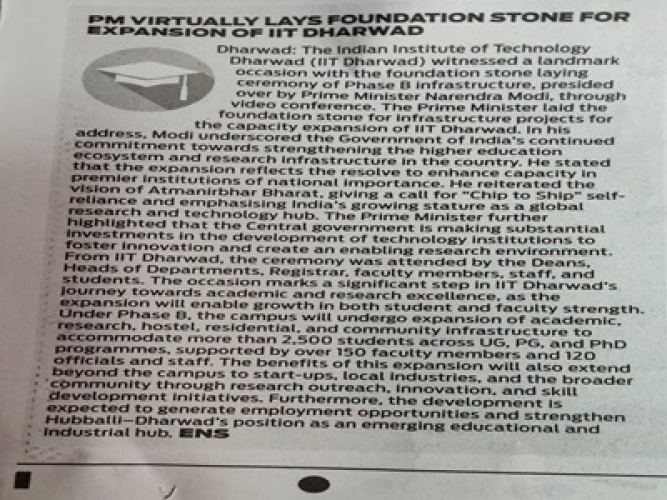 Media coverage of IIT Dharwad bags projects worth Rs 179cr