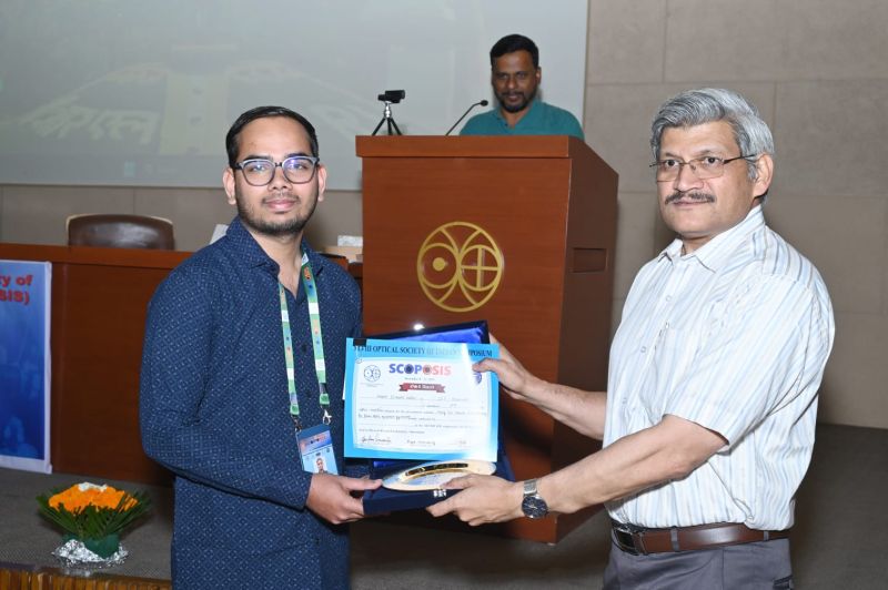 Mr. Gopal Prasad Sahu, Research scholar, Department of physics, has been awarded with the 2nd Best Poster Presentation Award for his presentation on "Hong Ou Mandel Interferometry for Fiber Optic Quantum Gyroscope", at the SCOPOSIS 2025, a joint event that brings together the decadal edition of the Student Conference on Optics and Photonics (SCOP) and the 48th Optical Society of India Symposium (OSIS).
